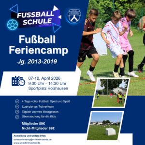 Unsere Fußballcamps bieten vier Tage voller Fußball, Spiel und Spaß. In verschiedenen Trainingseinheiten vermittelt unser erfahrenes Trainerteam Inhalte aus den Bereichen Ballschule, Koordination und kleine Spielformen. In verschiedenen Gruppen wird altersgerecht und in allen Niveaustufen der Jahrgänge 2013-2019 trainiert, sodass alle Spielerinnen und Spieler bestmöglich gefördert werden. In den Pausen werden die Kids mit Mittagessen, Obst, Gemüse, Riegeln und Getränken versorgt.