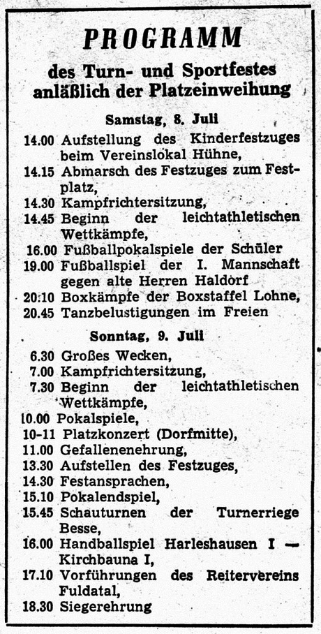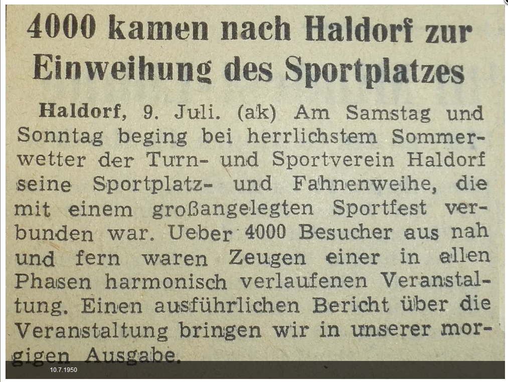 Diese Woche ist das Auestadion 64 Jahre alt geworden. Da haben wir Supporter uns gedacht, klappen wir doch mal die Mottenkiste auf und schauen, wie alt unser Stadion in Haldorf ist… Und siehe da, der Nobi-Park wurde mit einem ganzen Festwochenende am 08. und 09. Juli 1950 eingeweiht – leider noch ohne Rasen, da noch auf den Kostenzuschuss des Landes Hessen für den Grassamen gewartet werden musste – true Story!